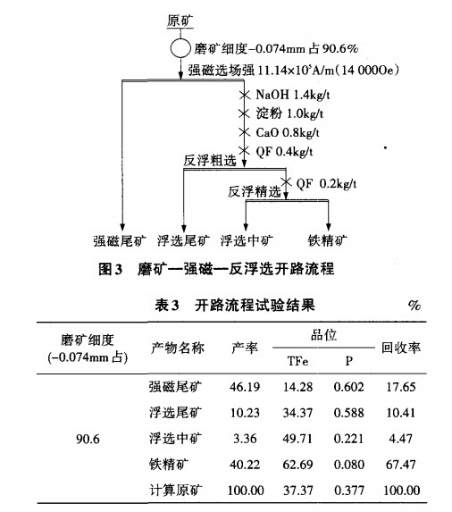 (3)原礦含磷0.377%,偏高,但磷礦物大多分布于石英中,選別過程中隨石英進(jìn)入尾礦,鐵精礦含磷降至0.085%,達(dá)到了國家標(biāo)準(zhǔn)。